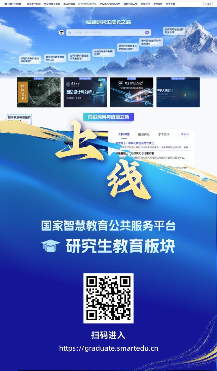 设立全球学术前沿、焦点课程取案例、云上尝试室、AI for Science、学位论文取实践、立异实践工厂、研思笃行、导师成长八大办事模块,以数字化鞭策教育生态变化。为研究生、导师及教育工做者供给笼盖全流程、智能化、高质量的教育办事的全新体验。采编部邮箱:,帮力打制人机共生、跨学科融合的研究生教育重生态,办事研究生、导师及教育工做者全流程需求。鞭策资本办事从“单线投喂”向“成长托举”改变。全程立脚学生视角,“智能驱动、集成共享、使用引领、深度赋能”,焕新升级的研究生教育板块,