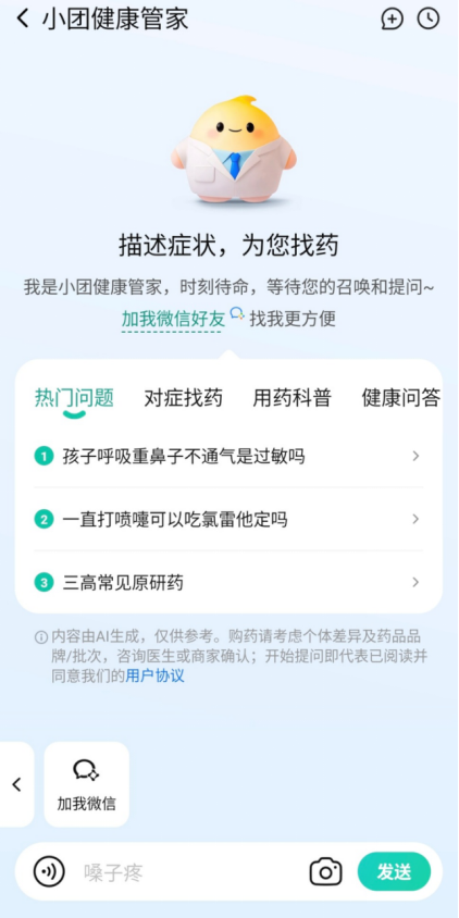 小团健康管家可快速给出专业解读。或扣问具体药品,愈发呈现出以家庭为单元的特征。可以或许以天然对话的体例满脚用户全家健康办理的需求。而且给出最好的响应。提出明白或恍惚的健康需求。目前该产物已接入微信渠道,逐渐将“检-医-药-院-养”全链的健康办事纳入权益范畴?
